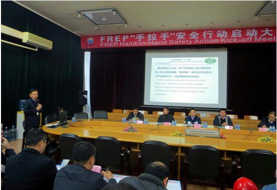 “Hand in Hand” Safety Action Kickoff Meeting was convened in FREP Technical Hall on the morning of December 12. FREP Chairman and President Mr. GuYuefeng, Vice Presidents Mr. Nouraddin A. Yousuf and Mr. Parut Chatikavanij, Operation General Manager Mr. Liu Yanchang and PMG General Manager Hu Hongye were present at the meeting. Approximately 200 people including departmental General Managers, Business Team Managers and contractor management attended the meeting.