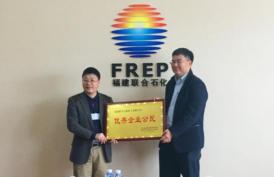 1月16日上午,泉港区南埔镇党委书记陈宗德带领南埔镇工作人员及施厝村、仙境村干部到福建联合石化拜访,送来感谢信,并颁发了南埔镇授予福建联合石化“优秀企业公民”奖牌,感谢公司在建设发展的同时,积极履行作为一名社区公民的社会责任,长期以来对周边社区的水利、道路、环境卫生、美丽乡村等社会事业建设的大力支持和帮助。