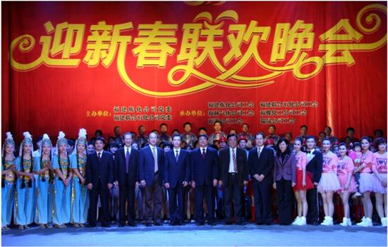在欢快的乐曲声中,福建炼化、福建联合石化公司领导陆东、陈晓波、杨洪斌、韩宝林、刘彦昌、胡红页、李思阳共同给公司全体员工、离退休老同志和职工家属拜年。