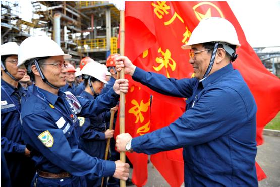 11月25日下午,公司党委在老厂区检修现场举行“2015年大修/改造党团员突击队立功竞赛授旗仪式”。公司党委书记陈晓波、党群工作部主任何庆东、机械设备部总经理兼大修经理庄晓东、生产部炼油总经理赵天星及参加检修的17支党团突击队代表参加仪式。